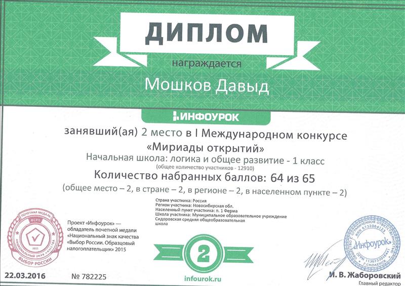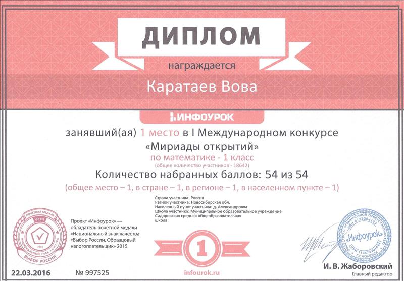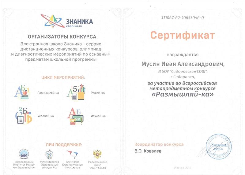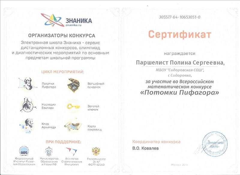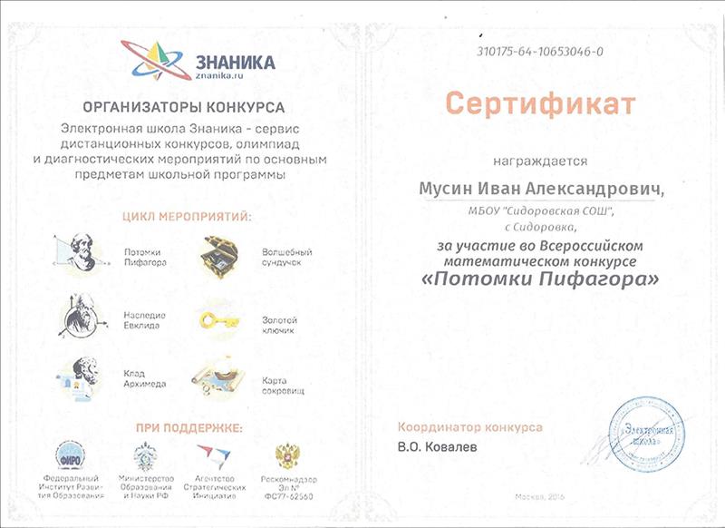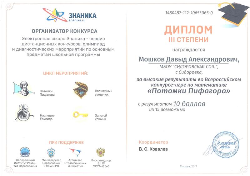 | Диплом за участие во Всероссийском конкурсе по математике "Потомки Пифагора" | Электронная школа | 15.11.2017 | Файл |