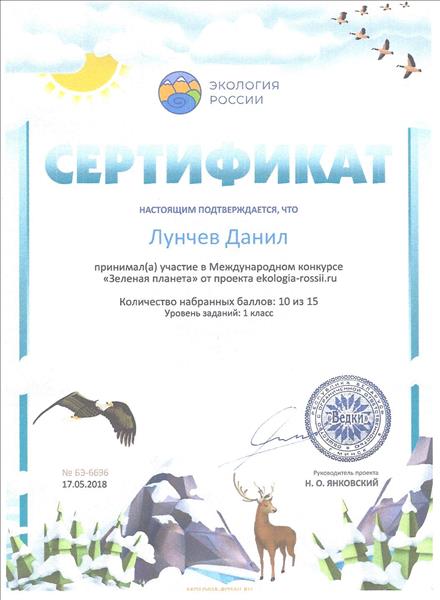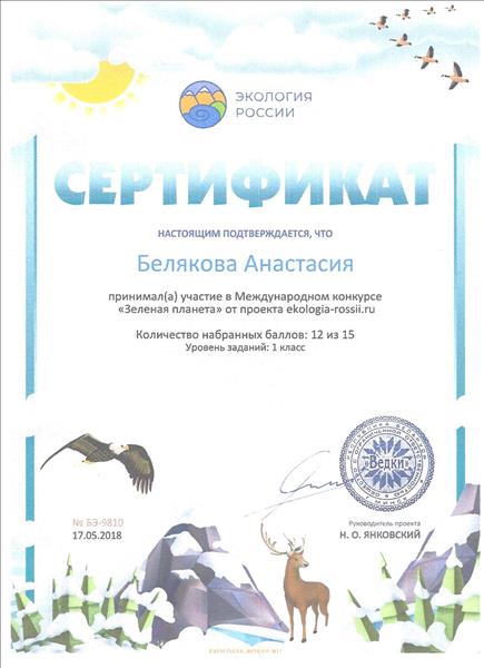 | Сертификат за участие в Международном Конкурсе "Зелёная планета" | ООО Ведки | 17.05.2018 | Файл |