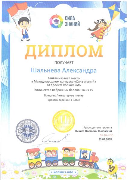 | Диплом за участие в Международном конкурсе "Сила знаний" по литературному чтению" | ООО Ведки | 23.04.2018 | Файл |