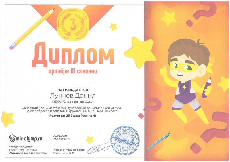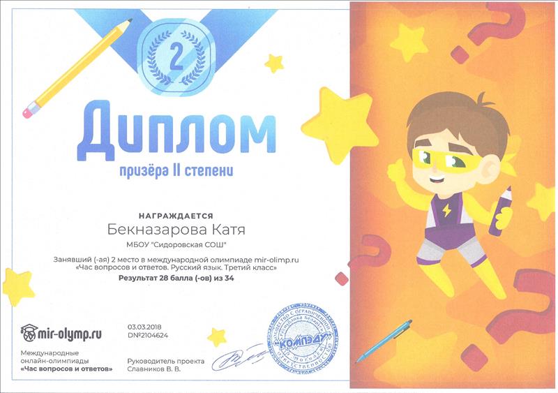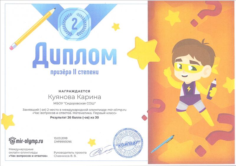 | Диплом за участие в Международной онлайн олимпиаде "Час вопросов и ответов" по русскому языку | Компэду | 03.03.2018 | Файл |