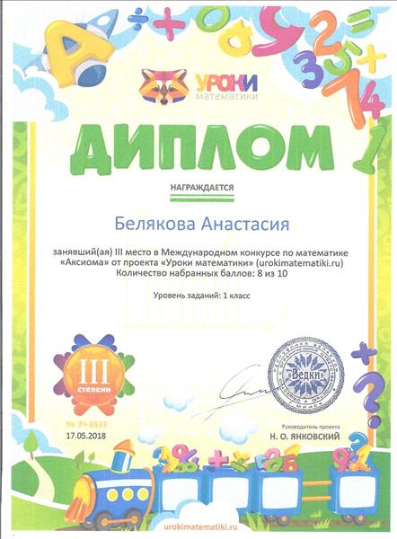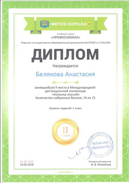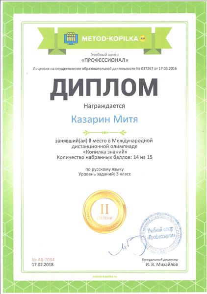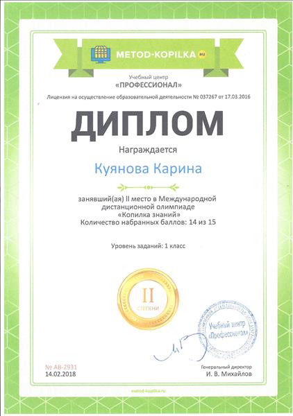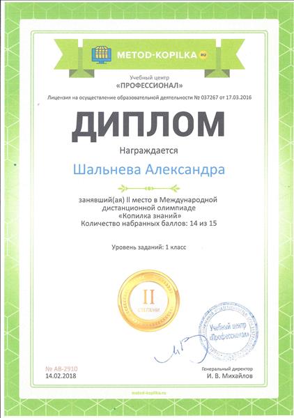 | Диплом за участие в Международной дистанционной олимпиаде "Копилка знаний" по математике | Учебный центр Профессионал | 22.02.2018 | Файл |