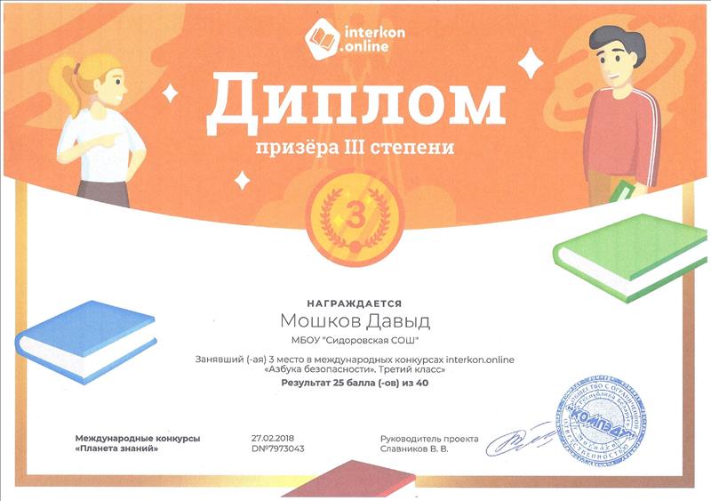 | Диплом за участие в международном конкурсе "Безопасный интернет" | ООО Ведки | 15.03.2018 | Файл |