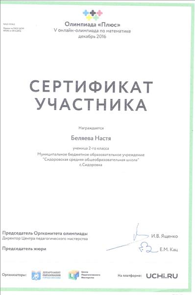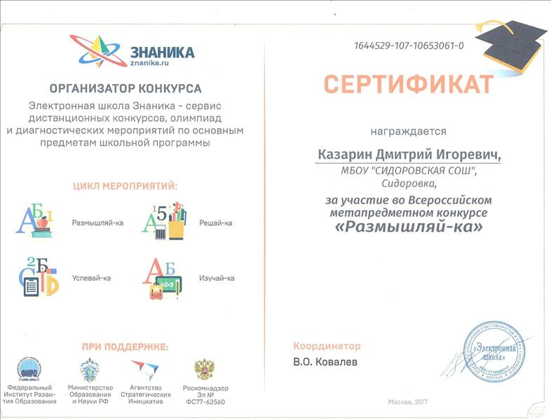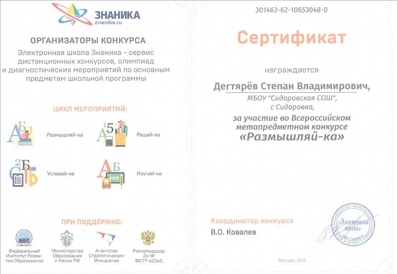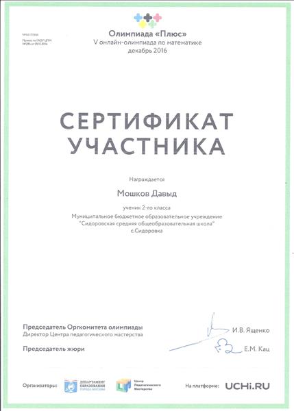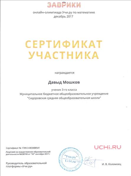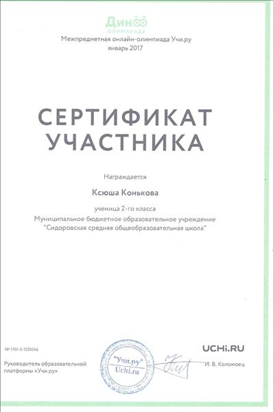 | Сертификат за участие в Межпредметной - онлайн -олимпиаде Учи.ру. Дино олимпиада | Учи.ру | 20.01.2017 | Файл |
