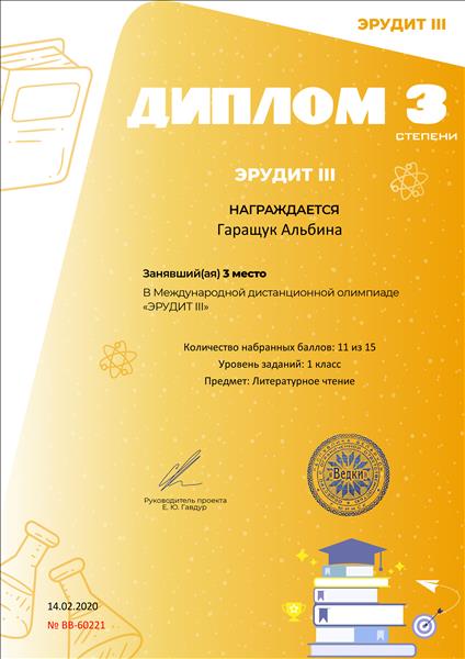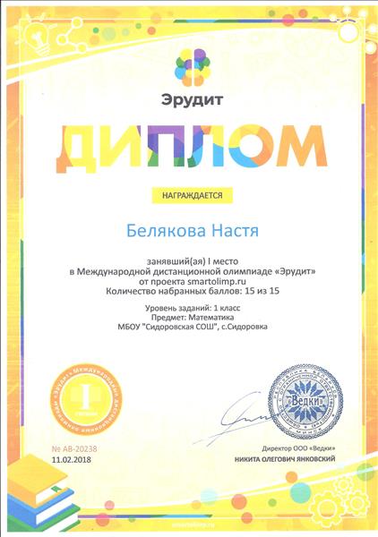 | Диплом за участие в Международной дистанционной олимпиаде "Эрудит" . Математика. | ООО Ведки | 11.02.2018 | Файл |