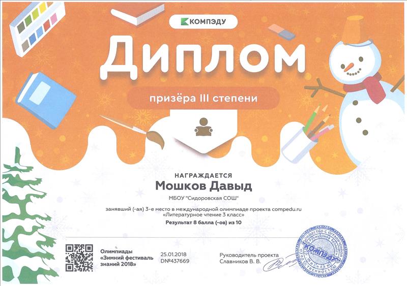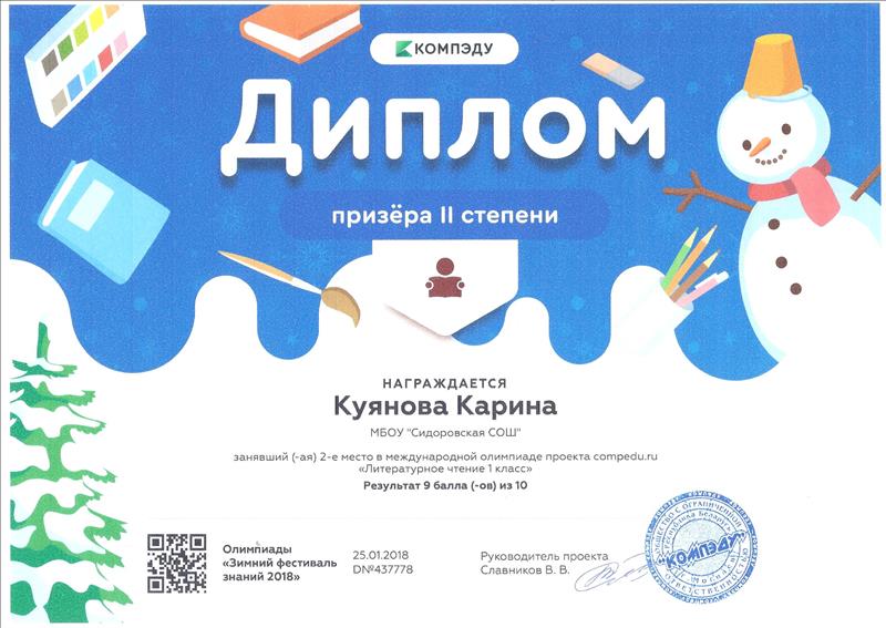 | Диплом за участие в Международной олимпиаде compedu. ru по литературному чтению | Компэду | 25.01.2018 | Файл |