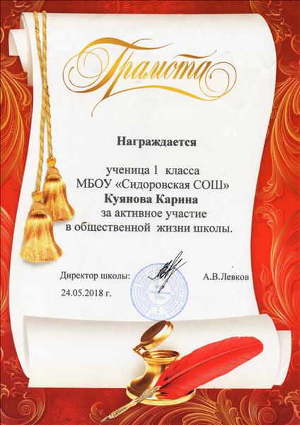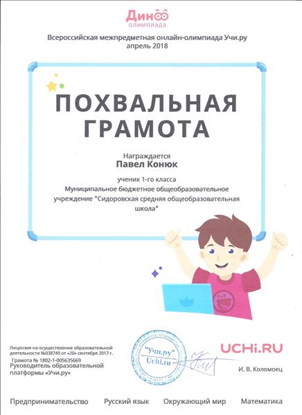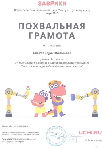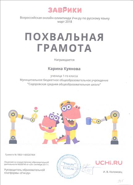 | Похвальная грамота за участие во Всероссийской онлайн -олимпиаде Учи.ру по русскому языку | Учи.ру | 13.03.2018 | Файл |