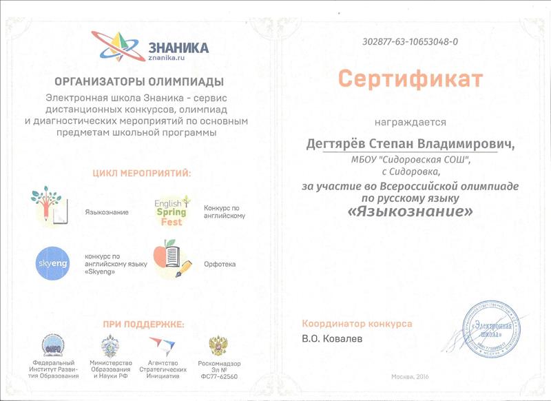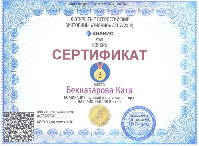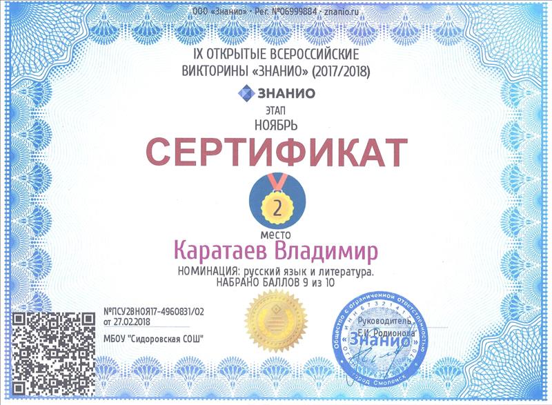 | Сертификат за участие в IX Всероссийской викторине "Знанио" по русскому языку и литературе | Знанио | 27.02.2018 | Файл |