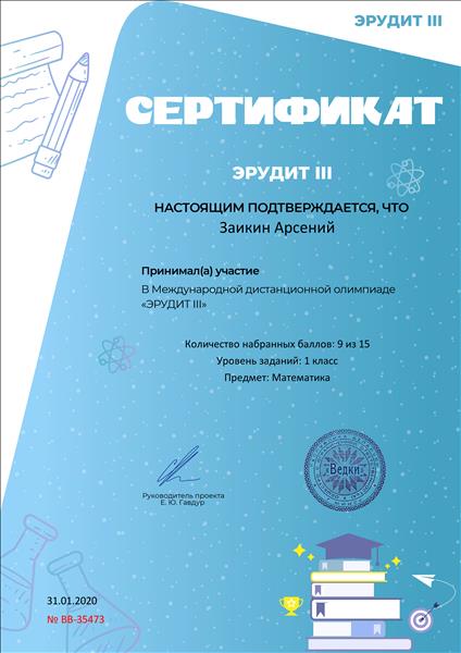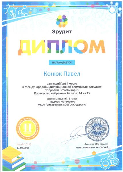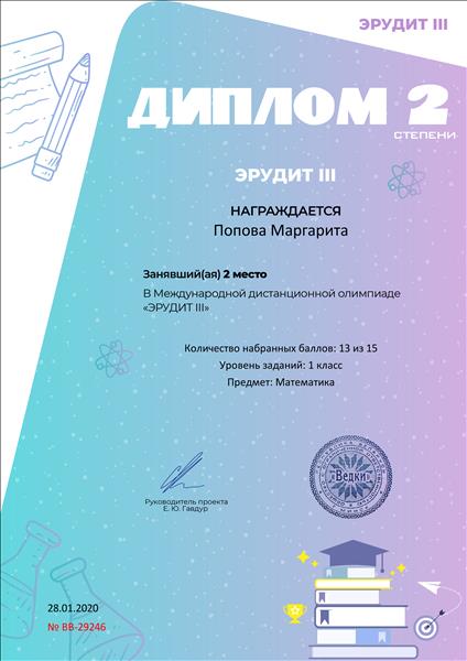 | Диплом за участие в Международной дистанционной олимпиаде "Эрудит". математика. | ООО Ведки | 11.02.2018 | Файл |
