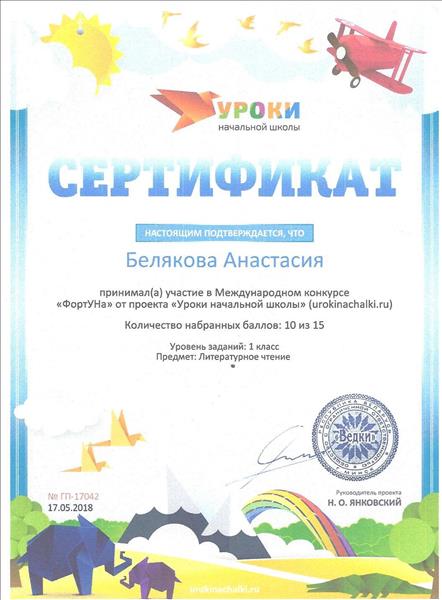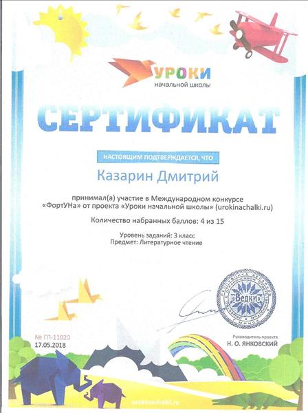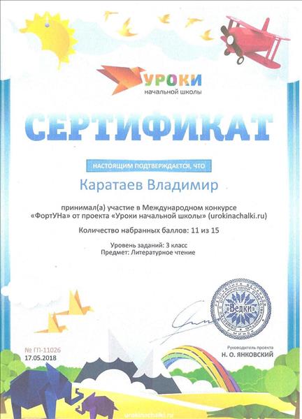 | Сертификат за участие в Международном конкурсе "Фортуна" по литературному чтению | ООО Ведки | 17.05.2018 | Файл |