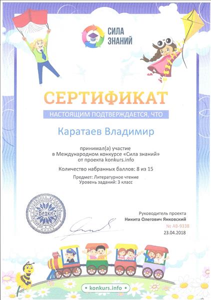 | Диплом за участие в Международном конкурсе "Сила знаний" по литературному чтению | ООО Ведки | 23.04.2018 | Файл |