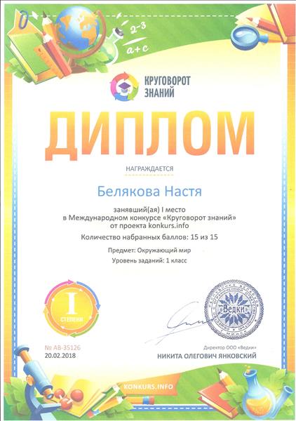 | Диплом за участие в Международном конкурсе "Круговорот знаний" по окружающему миру | ООО Ведки | 20.02.2018 | Файл |