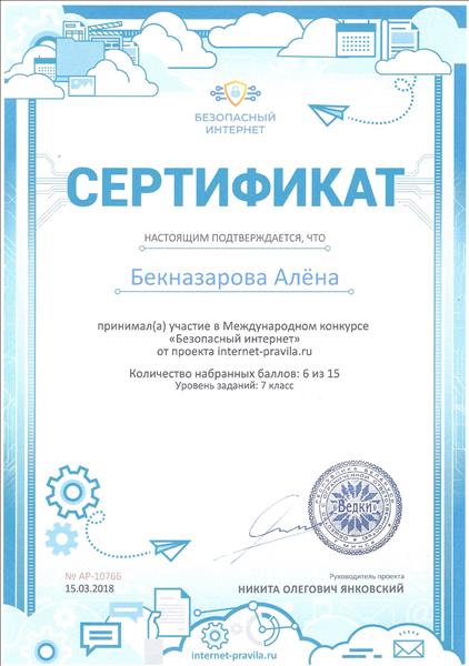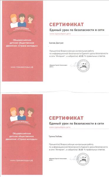 | Сертификат за участие во Всероссийской контрольной работе по информационной безопасности "Единый урок" | | 19.10.2018 | Файл |