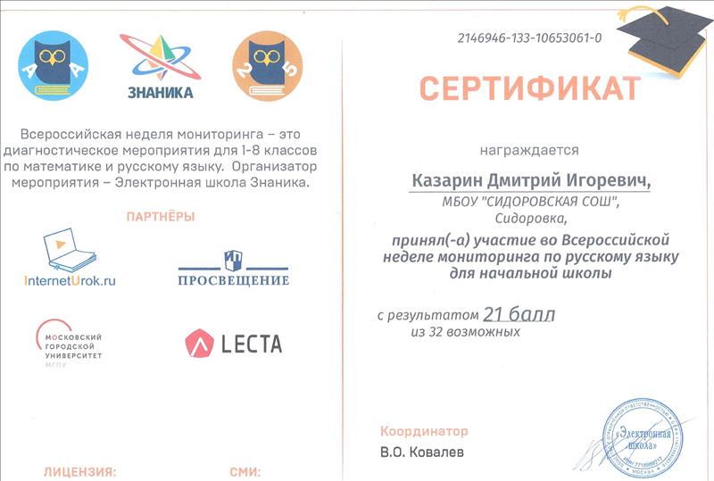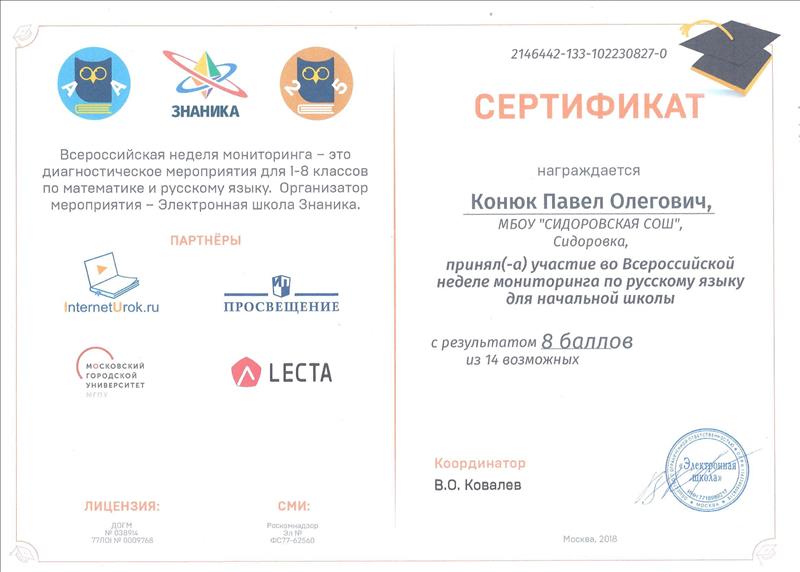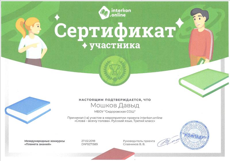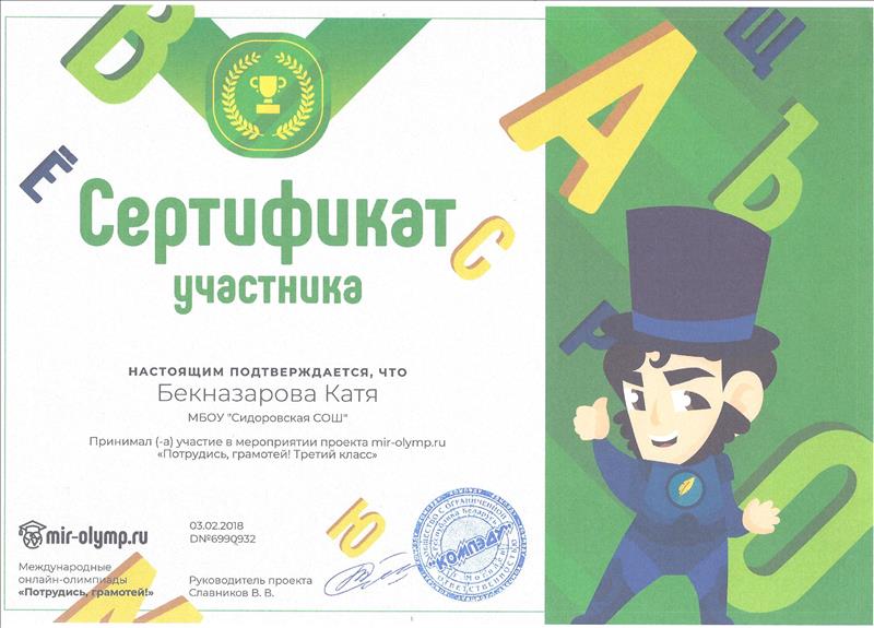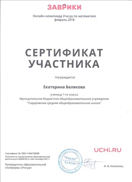 | Сертификат за участие во Всероссийской онлайн - олимпиаде Учи.ру по русскому языку | Учи.ру | 13.03.2018 | Файл |