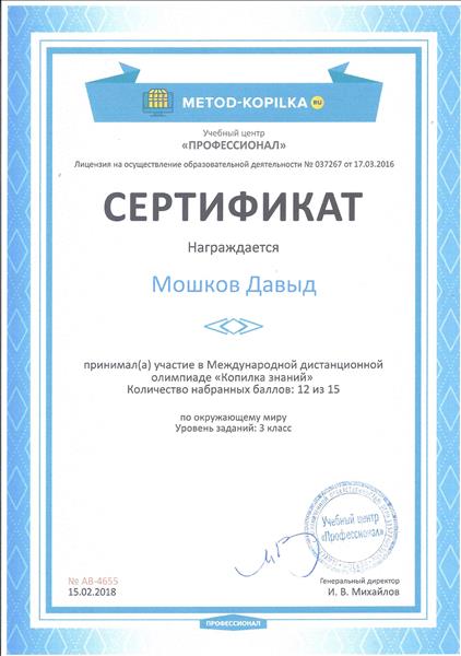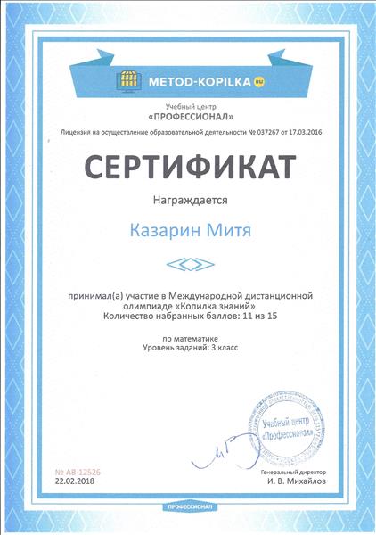 | Сертификат за участие в Международной дистанционной олимпиаде "Копилка знаний" по математике | Учебный центр Профессионал | 22.02.2018 | Файл |