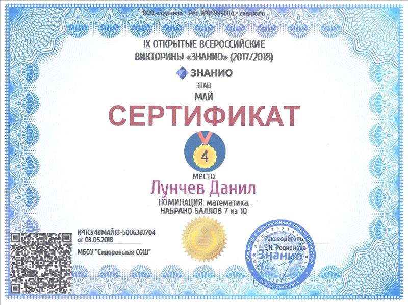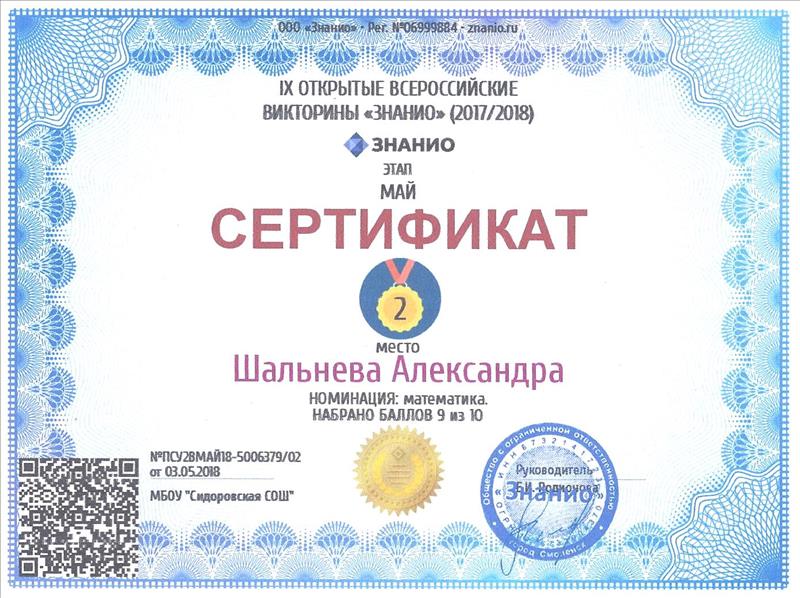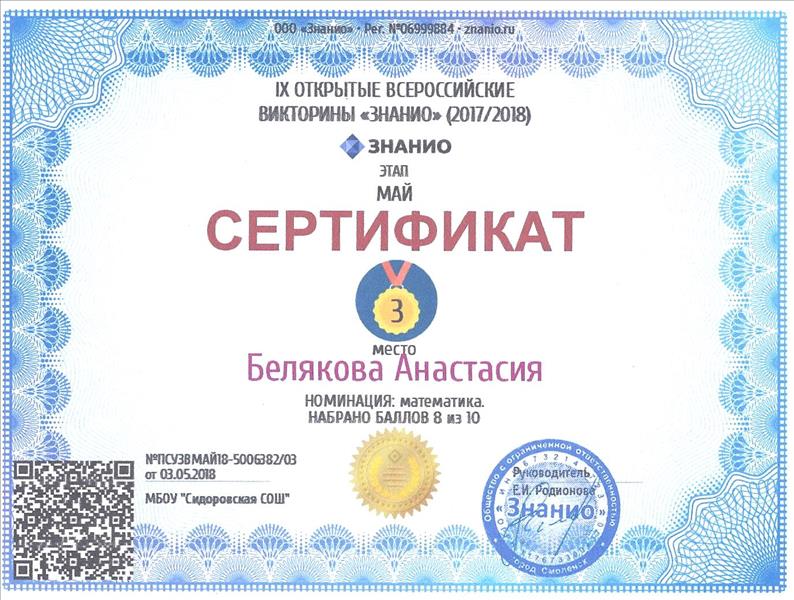 | Сертификат за участие в IX Открытой Всероссийской викторине "Знанио". по математике. | Знанио | 03.05.2018 | Файл |