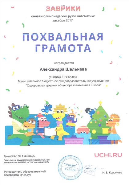 | Похвальная грамота за участие в онлайн - олимпиаде Учи.ру по математике | Учи.ру | 21.12.2017 | Файл |