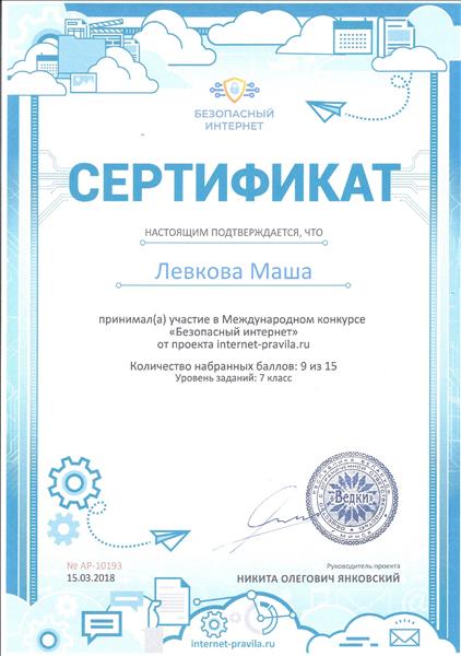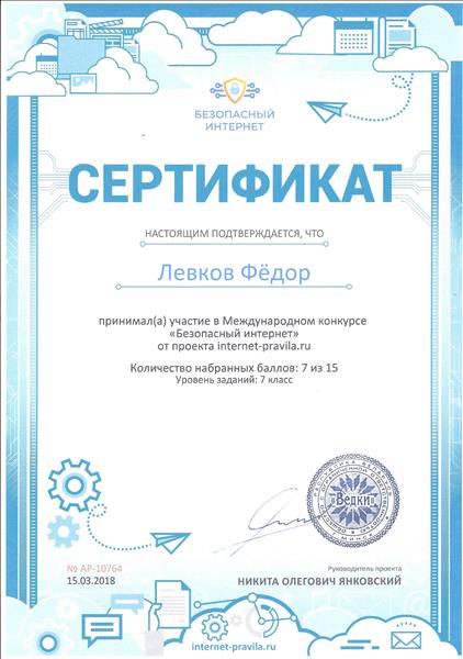 | Сертификат за участие в Международном конкурсе "Безопасный интернет" | ООО Ведки | 15.03.2018 | Файл |