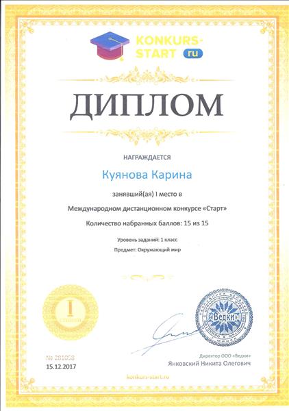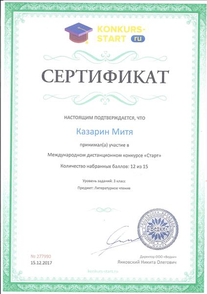 | Диплом за участие в Международном конкурсе "Старт" по математике | ООО Ведки | 15.12.2017 | Файл |