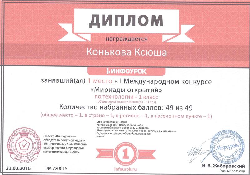 | Диплом победителя Международного конкурса Старт" . Русский язык. | ООО "Ведки" | 15.12.2017 | Файл |