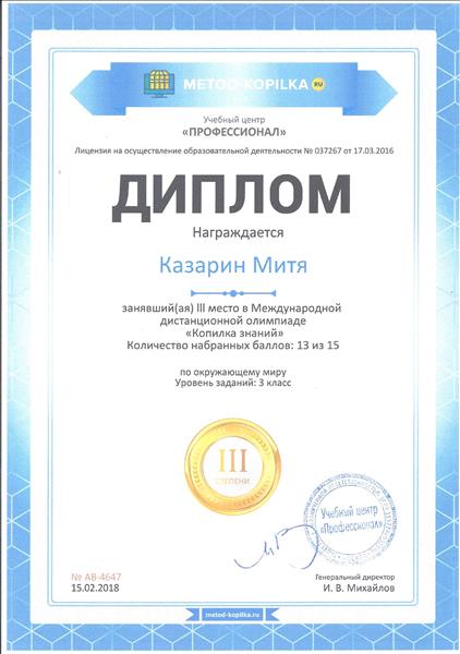 | Диплом за участие в Международной дистанционной олимпиаде "Копилка знаний" по окружающему миру. | Учебный центр "Профессионал" | 15.02.2018 | Файл |