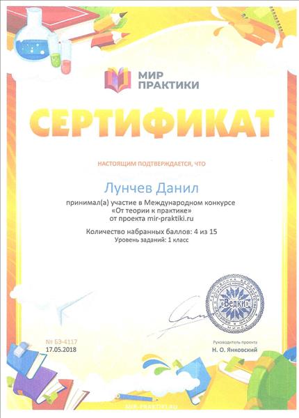 | Сертификат за участие в конкурсе "От теории к практике" | ООО Ведки | 17.05.2018 | Файл |
