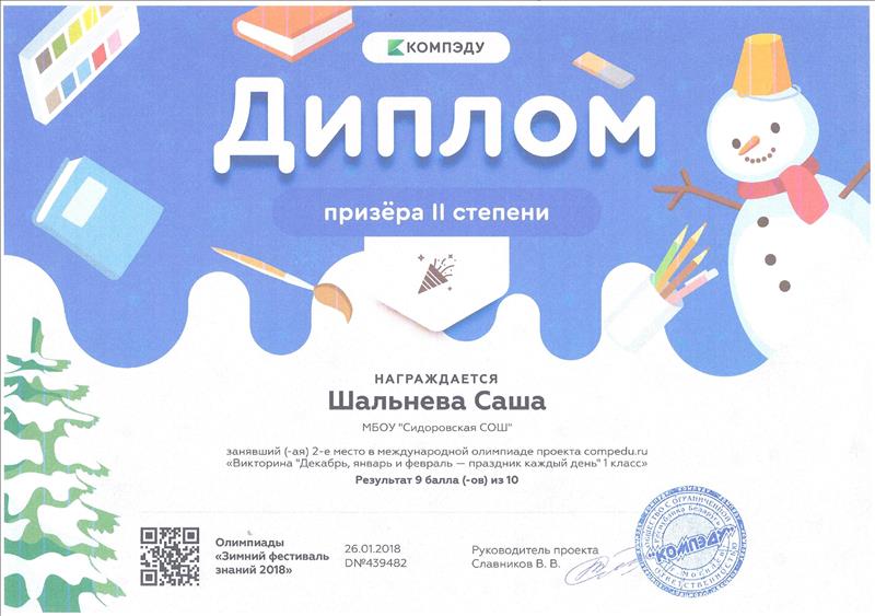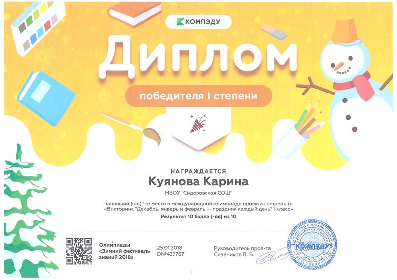 | Диплом за участие в Международной олимпиаде compedu.ru Викторина "Декабрь, январь и февраль праздник каждый день" | Компэду | 25.01.2018 | Файл |