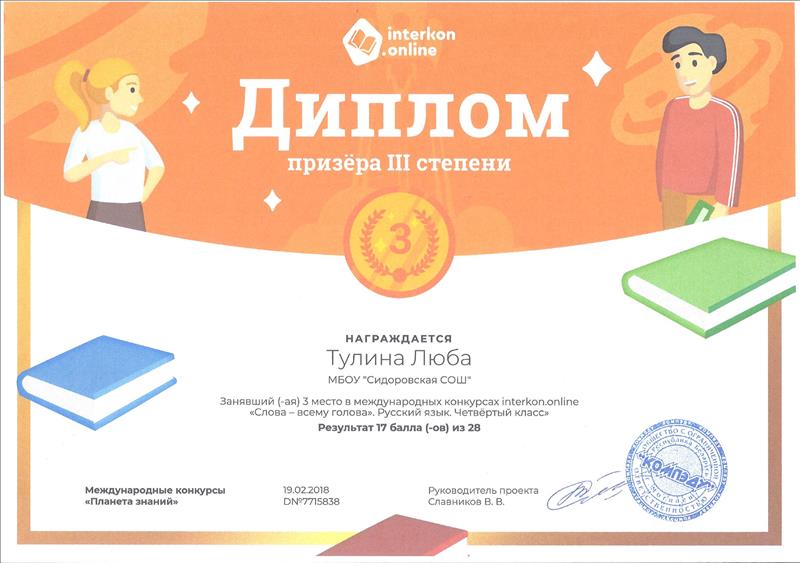 | Диплом за у. русский язык.частие в Международном конкурсе "Планета знаний" | Компэду | 27.02.2018 | Файл |