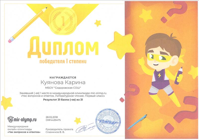 | Диплом за участие в Международной олимпиаде compedy.ru по литературному чтению | Компэду | 25.01.2018 | Файл |
